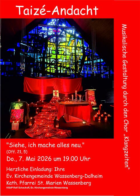 Unter dem Namen "Klangzeiten" treffen sich Sangesfreudige regelmäßig jeden 2. und 4. Donnerstag im Monat von 19:00-20:30 Uhr im Pfarrheim von St. Maria Himmelfahrt, Am Stadtrain 3, 41849 Wassenberg. Der Kreis sucht Sängerinnen und Sänger. Es werden neue (geistliche) Lieder eingeübt. Auskunft bei Janette Lisson, janette.lisson3008@gmail.com)
