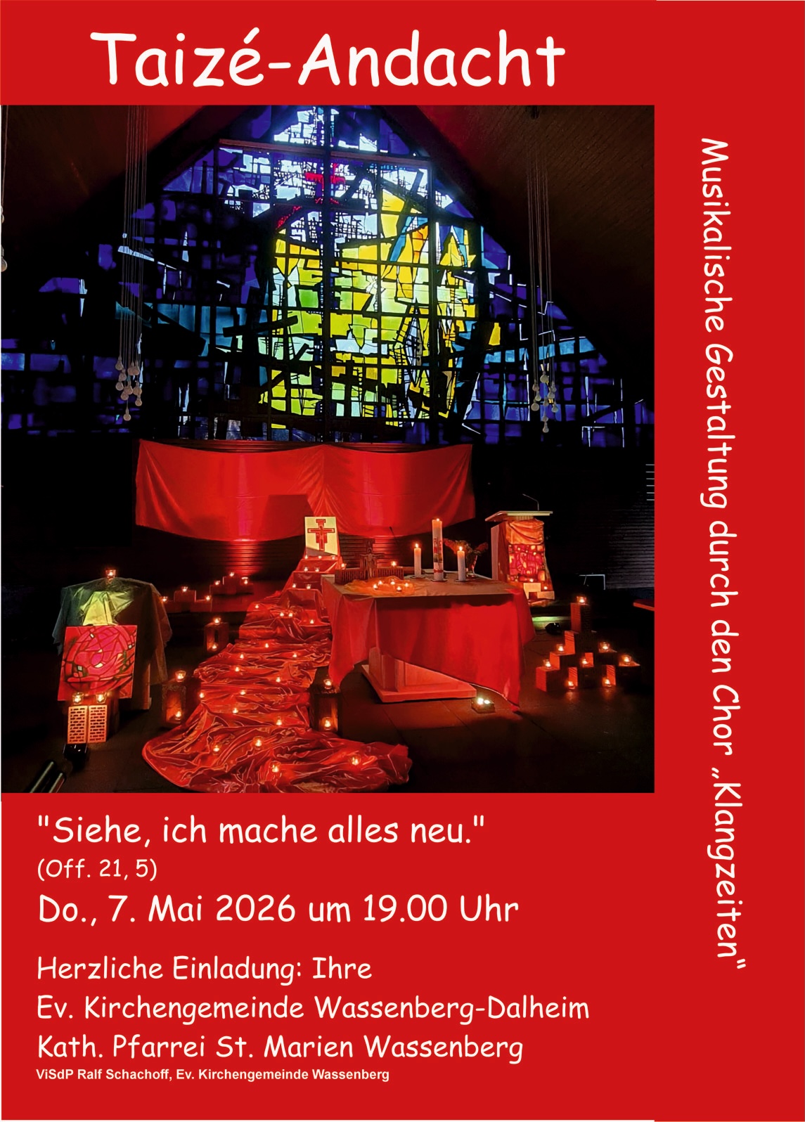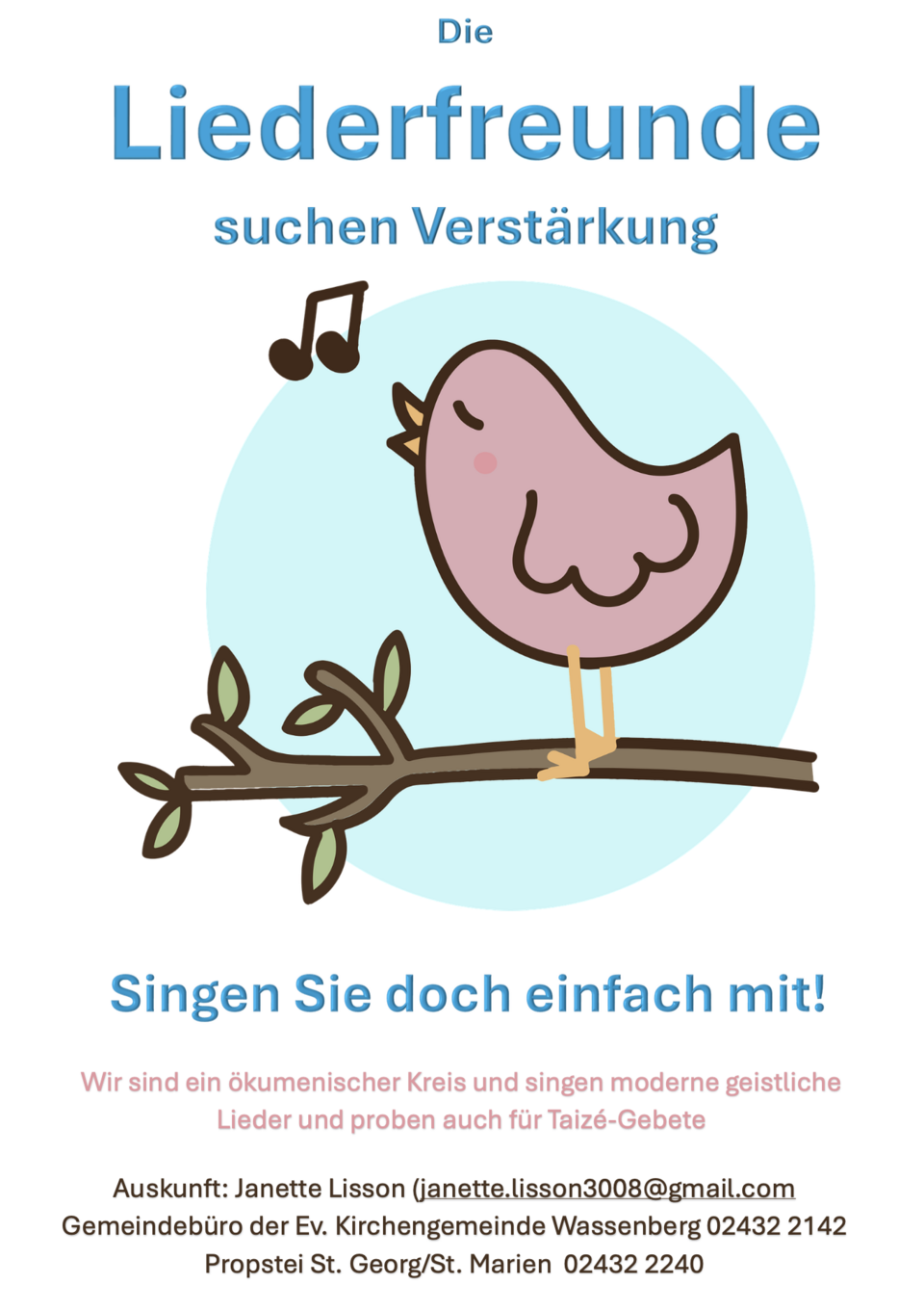 Unsere ökumenischen Taizé-Gebete feiern wir im Wechsel entweder in der Ev. Kreuzkirche oder in der kath. Kirche St. Georg (gel. auch in einer anderen kath. Kirche). Die Termine werden über Abkündigungen und Plakate bekannt gegeben. Informationen erhalten Sie im Gemeindebüro Tel. 02432 2142 oder bei Janette Lisson (janette.lisson3008@gmail).